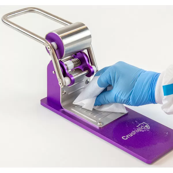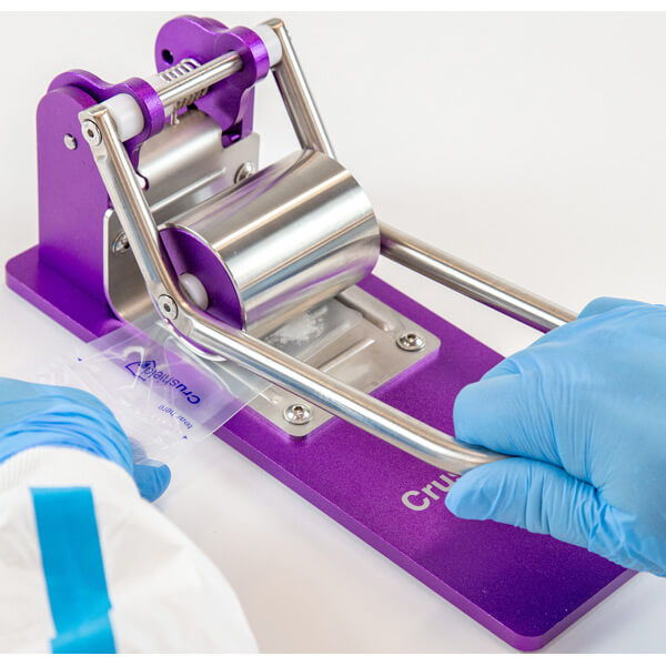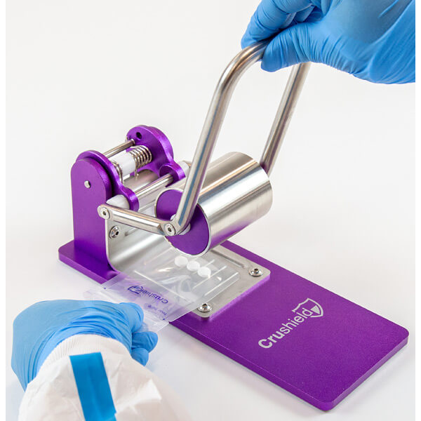 Crushield® Pouch Pill Crusher is a patented pouch pill crusher featuring an open, easy-to-clean design, ergonomic hoop handle, and powerful crusher roller that safely and easily pulverizes medications into a fine powder.